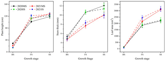 As shown in Figure 8, the plant height, stem thickness, and leaf area of MS and IS all increased continuously with the advancement of the growth period and increased rapidly in the branching and pod stages. Compared with MS, IS significantly increased the soybean plant height at the FS by 10.50%. In 2020, compared with MS, IS significantly reduced the stem thickness of soybean at the seed filling stage by 26.33%, and in 2021, compared with MS, IS significantly increased the leaf area of soybean at the FS by 28.48%.