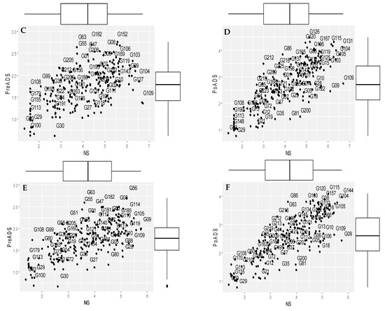 Biplots showing the groupings of 225 sorghum genotypes based on grain yield under NS, PreADS, and PoADS in glasshouse and field environments are shown in Figure 1. Grain yield performance under PreADS versus NS conditions in a glasshouse environment (Figure 1A) revealed genotypes G56 as being more suitable for both stressed and non-stressed environments (Group A), while G09 is more desirable for non-stress conditions (Group B). Similarly, genotypes G145 and G1 recorded relatively higher grain yield only under PreADS in a glasshouse environment (Group C), whereas genotypes G100 and G03 were sensitive to drought due to poor yield performance in both PreADS and non-stress conditions (Group D). Biplots showing grain yield performance under PoADS versus NS conditions in a glasshouse environment (Figure 1B) revealed genotypes G08 and 144 as drought tolerant with high performance in both conditions (Group A), while genotypes G09 and G10 were more suitable for a non-stress environment (Group B) and recorded a high grain yield of ~2.40 t/ha (Figure 1B). Genotypes G81 and G35 are more desirable for stressed conditions (Group C). Genotypes G29 and G100 are drought-susceptible and recorded low grain yields under PoADS and NS conditions in a glasshouse environment (Group D).