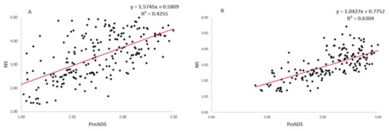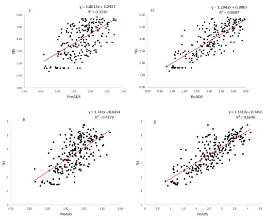 Simple linear regression model fitting grain yield (t/ha) performance of 225 sorghum genotypes evaluated under non-stressed (NS), pre-anthesis drought-stress (PreADS), and post-anthesis drought-stress (PoADS) in the glasshouse (A,B) and field (C,D) environments, and across both glasshouse and field (E,F) environments.