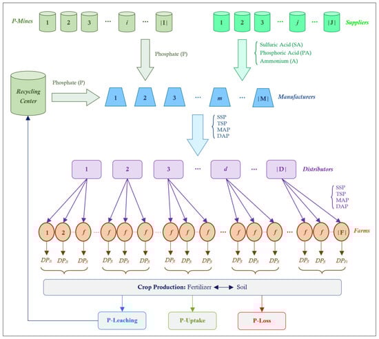 Nowadays, investigating supply chain management (SCM) is increasingly encouraged in mining, manufacturing, and agriculture. Optimizing SCM can be described as a strategic management decision considering other decisions in the supply chain. In today’s economy, sustainability is one of the crucial issues []. To design a renewable and sustainable P-fertilizer supply chain management (PFSCM) various challenges including PR mining, assessing P-loss throughout the supply chain, and environmental protection issues should be taken into account []. Mathematical modeling and optimizing of existing PFSCM strategies are a neglected concern in the context of operational research so far.
