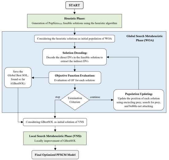 Contrary to the previous studies, this paper aims to address a combined three-stage heuristic–metaheuristic approach with global and local search strategies to find a high-speed, high-precision, and high-solution-quality method to solve the sustainable PFSCM problem. In this regard, a problem-dependent heuristic is proposed to generate a set of feasible solutions as the initial population of the population-based metaheuristic, i.e., a whale optimization algorithm (WOA), followed by a single-solution metaheuristic, i.e., a variable neighborhood search (VNS). The key contributions in this paper are as follows: