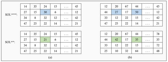 Based on the number of solutions encountered in each iteration, metaheuristics can be categorized into population-based (global search) and solution-based (local search) methods []. Population-based metaheuristics investigate the search space in parallel (i.e., more exploration), while solution-based metaheuristics attempt to locally improve the quality of the current solution using local search operators (i.e., more exploitation). To achieve a better trade-off between solution quality and speed, we propose a combined three-stages heuristic–metaheuristic approach with balanced exploration–exploitation strategies to efficiently solve the PFSCM model. In the first stage, a heuristic algorithm is designed to generate feasible solutions while satisfying all constraints. These solutions are fed into the population-based metaheuristic based on WOA; then, a solution-based metaheuristic based on VNS is performed to further improve the best solution of WOA through local search operators.