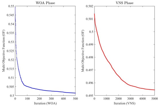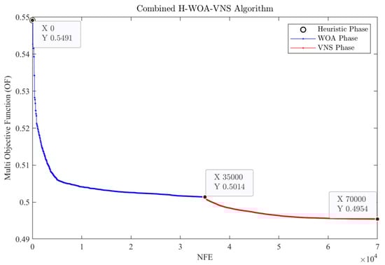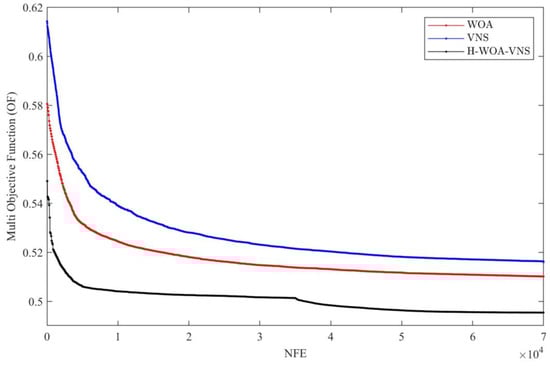The best OF versus NFE obtained by WOA, VNS, and H-WOA-VNS.
