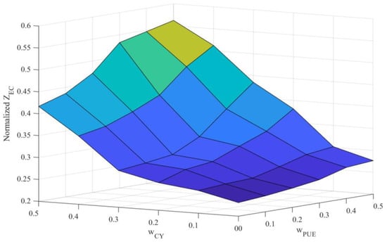 Sensitivity analysis of the environmental weights on the normalized economic cost: the lower the value for the weights of environmental objectives (either wCY or wPUE) is, the higher the value for the economic objective (wEC) is considered, and thus, a lower economic cost (ZEC) is obtained.