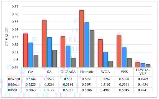 To give an insight into the improved effectiveness of the proposed H-WOA-VNS algorithm over its components (Heuristic, WOA, and VNS) and the existing metaheuristics (GA, SA, and GLGASA), the worst, mean, and best OFs obtained by the different methods over 10 successive runs are compared in Figure 10. Moreover, improvement % of H-WOA-VNS against other techniques is provided in Table 18. The results demonstrate the superiority of the proposed algorithm against the compared methods. It not only achieves the best results among all techniques, but also, more importantly, it has a much smaller deviation than the other methods. The STD% of the H-WOA-VNS algorithm over 10 runs is only 0.19%, while it varies from 1.45% to 2.33% for the other methods.