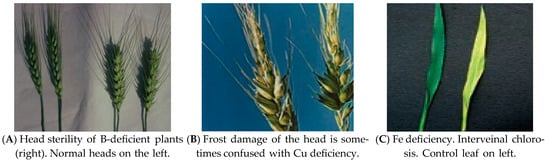 Boron deficiency was first observed in Australia, Egypt, France, Poland, Taiwan, the United States, Russia, and Ukraine. That is why boron fertilizers are used more widely than other micro-fertilizers in developed countries [102]. Boron deficiency is becoming more common in cereals. However, the requirement for boron is relatively low compared to other micro-fertilizers. Both boron toxicity and deficiency reduce crop output and the life cycle of plants by causing poor grain sets, leading to a poor yield [103]. The absence of boron in any developmental stage of wheat results in aborted pollen grains, a reduced seed quality, fewer grains per spike, and other problems (Figure 1) [104,105]. The results of the research undertaken by Brdar-Jokanovi et al. [106] showed that the consequences of B nutrition disorder are more noticeable in species in which the element is phloem-immobile and during plant reproduction.