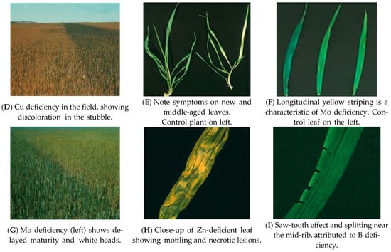Mo deficiency symptoms include chlorosis on leaves, stunted growth, and a necrotic appearance of the leaf tips [127]. Mo and N deficiencies have similar effects. Their deficit leads to the retardation of wheat growth, hence lowering the nutritive quality of the grain (Table 1) [128].