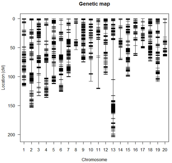 A genetic linkage map was constructed from the genetic data of 302 RIL using R/qtl [26]. The estimated map length was 2032 cM and utilized 17,232 markers. Markers with no recombination were eliminated, and the linkage map was constructed using 12,730 markers (Figure 1). Chromosomal locations of QTL were determined by composite interval mapping (CIM) [26,27]. An interval size of 2 cM with the default parameter of three markers per trait was used to conduct CIM [26]. The LOD threshold of 3.0 was consistently applied to identify both seed protein and seed oil on each of the twenty soybean chromosomes.
