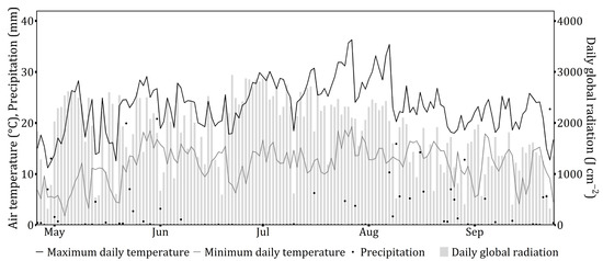 The experimental unit was a 9 L round plastic pot filled with a 1:1 mixture of steamed sandy loam and peat. The sandy loam contained 2.6% organic matter, 46.7% silt (2–50 µm), 43.4% sand (>50 µm), and 10.0% clay with a pH-KCl of 5.5. At the start of each growing season, on the 26th of April, a single mother tuber was placed in each pot at a depth of 4 cm. These tubers were pre-sprouted (BBCH 07, i.e., the beginning of sprouting) on a moistened 9 cm diameter filter paper (Rotilabo-Rundfilter type112A, Carl ROTH GmbH, Germany) placed on a germination table (‘Arec-cooling technology’, Belgium) under a 24/18 °C day/night temperature regime and 16/8 h day/night light cycle. Mother tubers used to establish each clonal population came from the bulked tuber samples from the field (year 2018) or from mature daughter tubers (one from each pot) produced in previous experimental year (years 2019 and 2020). Within a clonal population, the size of mother tubers was kept constant (median size was chosen) to avoid possible maternal tuber size effects on C. esculentus growth. Immediately after planting, the pots were placed outdoors on a concrete floor and were irrigated by natural rainfall and overhead sprinklers as needed. Pots were fertilized five times with a two-week interval starting from the 22nd of June. The fertilizer dose was 200 mL of a 1% solution of DCM house and garden (NPK 3-2-5) per pot. Figure 2 shows the daily global radiation and min. and max. daily temperatures for each year, measured by the nearby meteorological station.