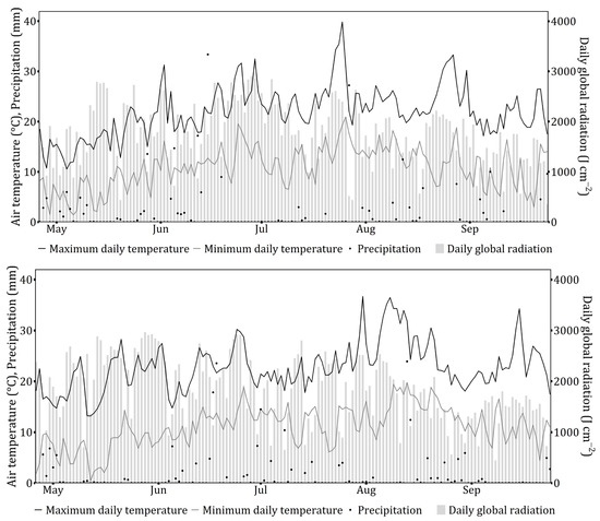 Maximum and minimum daily temperature (°C), precipitation (mm), and daily global radiation (J cm−2) during the experimental period of the morphological experiment in 2018 (top), 2019 (middle), and 2020 (bottom).