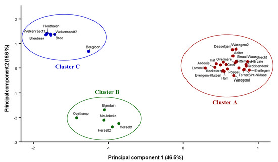 In addition, cluster A also showed a broader spatial geographic spread, as can be seen in Figure 1, than clusters B and C. Owing to its proliferous seed production, cluster A is less dependent on spread via tubers than clonal populations from clusters B and C. Seeds can be carried over longer distances than tubers as they easily survive passage through the digestive tract of fruit and seed-eaters such as waterfowl and terrestrial birds [39]. Given their small size, they attach much more strongly than tubers to machines (e.g., tire crevices, cultivator tines, ploughshares) and shoes. The existence of highly generative clonal populations is of a particular concern for regions with a high share of arable crops that are largely maintained through contracting work, as is the case for Flanders with a high share of maize. When Cyperaceae seeds end up in the chopped maize (whole-plant or corn cob mix), they may survive the ensiling process, passage through the ruminant digestive system and manure storage [40], and quickly become dispersed over a wide area by the spreading of the livestock manure.