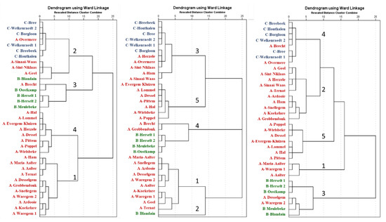 - Ward, J.H., Jr. Hierarchical grouping to optimize an objective function. J. Am. Stat. Assoc. 1963, 58, 236–244. [Google Scholar] [CrossRef]