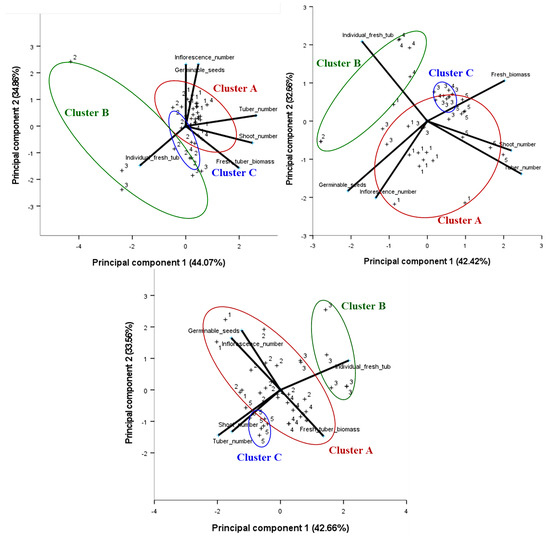 For each experimental year, a CATPCA biplot was made to illustrate the differences between the clusters. These are given in Figure 6. The three biplots depict the clonal populations, numbered according to the cluster numbers given in Figure 5. Along the first axis of the biplots, the tuber and shoot number on one side and the individual tuber fresh weight on the other side are able to separate the clusters over the three experimental years as the vectors are pointing almost in the exact opposite directions, separating the clonal populations and clusters from one another. Shoot and tuber number were highly correlated, especially in 2019 and 2020. Along the second axis, clusters were separated by means of the fresh tuber biomass on one side and the inflorescence number and germinable seeds on the other side. The biplots show the high correlation between the inflorescence number and number of germinable seeds.