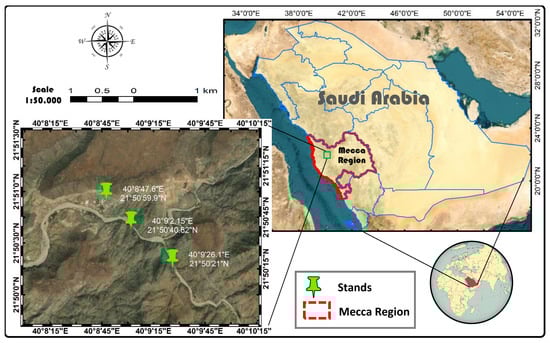 Fresh, whole plant materials (10 individuals) were collected from various localities in the northeast of Mecca (e.g., Wady Galil, Arnah and Wady AlKherar) during the period of 2021–2022 (Figure 1). Specimens were identified, and the synonyms were derived from the International Plant Names Index (IPNI; http://www.ipni.org/ipni/plantnamesearchpage.do, accessed on 5 January 2022) and Plants of the World Online (Plants of the World Online/Kew Science). Morphological description was made directly from fresh materials. For anatomical studies, 3–5 specimens of internodes and mature blades were taken from basal leaflets. The materials were prepared for microtome sectioning with a 10–15 µm thickness using the conventional Johansen procedure []. Sections were mounted in Canada balsam and dyed with safranin-light green standard double stain [].