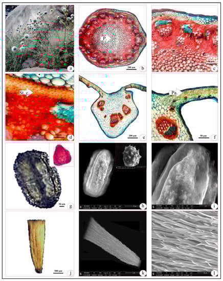 Macro- and microphotographs of the studied taxa: (a). Whole plant (b–d). Stem cross-section (e,f). Lamina vertical section (g–i). Pollen morphological characters (LM and SEM) (j–l). Achene morphological characters (LM and SEM). P—pith; Pa.—palisade layer; St. c.—stone cell.