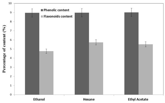 Total phenol and flavonoid content (%) of ethanolic, hexanolic, and ethyl acetate Echinops spinosissimus extracts.