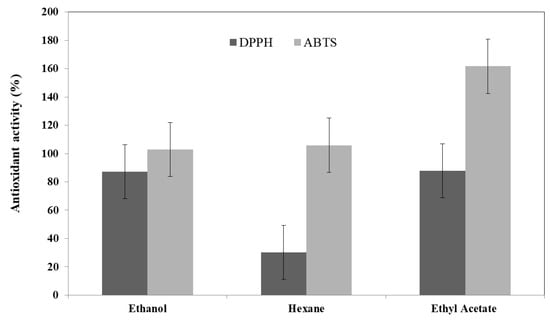 Analysis of Echinops spinosissimus extracts’ total antioxidant activity revealed that the ethyl acetate extract from the aerial parts had a high level of overall antioxidant capacity and free radical-scavenging abilities. The total antioxidant activity reached 87.72 and 161.66 % for DPPH and ABTS, respectively. Moreover, another extract (ethanol and hexane) also displayed antioxidant activity (Figure 4). This may be due to antioxidant phytochemicals such as phenols, flavonoids, cardiac glycosides, and alkaloids that were extracted from E. spinosissimus via the used solvents [].