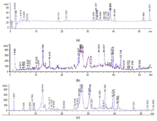 Using an Agilent Technologies 1100 Series liquid chromatograph outfitted with an autosampler and a diode-array detector, HPLC analysis was performed in accordance with Kim et al.’s findings []. An eclipse XDB-C18 (150 4.6 mm; 5 mm) C18 guard column was used as an analytical column (Phenomenex, Torrance, CA, USA). The mobile phase was composed of acetonitrile (solvent A) and 2% acetic acid in water (v/v) (solvent B). The gradient program was as follows: 100% B to 85% B in 30 min, 85% B to 50% B in 20 min, 50% B to 0% B in 5 min, and 0% B to 100% B in 5 min. The flow rate was maintained at 1 mL/min for the duration of the entire run time of 60 min. The peaks for flavonoids, benzoic acid derivatives, and cinnamic acid derivatives were all seen at the same time at 280, 320, and 360 nm. The injection volume was 20 µL. Before injection, all materials were filtered with an Acrodisc 0.45 µm syringe filter from Gelman Laboratory in Michigan. Peaks were located by matching UV spectra and retention periods, and they were then contrasted with the standards.