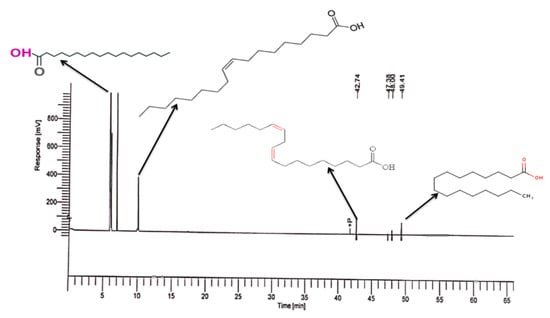 Four main compounds, including hexadecanoic acid, octadecanoic or stearic acid, oleic acid, and linoleic acid, were detected by using GC-MS (Figure 6). The hexane extract of plants mainly produces bioactive fatty acids []. In the current study, one fatty acid with C16 (hexadecanoic acid) was detected and three fatty acids with C18 were produced. Hexadecanoic acid exhibited many biological activities such as hypocholesterolemic, antioxidant, pesticide, and nematicide properties []. The stearic acid biological activity has antibacterial and antifungal properties []. Oleic acid is a fatty acid that occurs naturally in various animal and vegetable fats and oils, and it has been found to have antibacterial activity. Linoleic acid inhibited the growth of different Gram-positive bacteria [,].