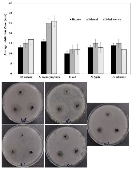 Antimicrobial properties of Echinops spinosissimus extracts at concentration of 100 mg/mL. Abbreviations: list.—Listeria monocytogenes; St.—Staphylococcus aureus; E.c.—E. coli; Sal., Salmonella typhi; C.A—Candida albicans; H—hexane extract; E—ethanol extract; EA—ethyl acetate.