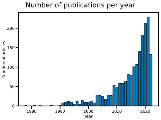 Analysing the number of publications per year throughout the investigated period (1977 to mid-2022) (Figure 2), it becomes immediately evident that the number of publications has experienced rapid growth in the last two decades. In fact, from 2017, the number of publications breaks through the threshold of 100 published per year; the trend is further accentuated in 2022, 130 research works already published by mid-year.