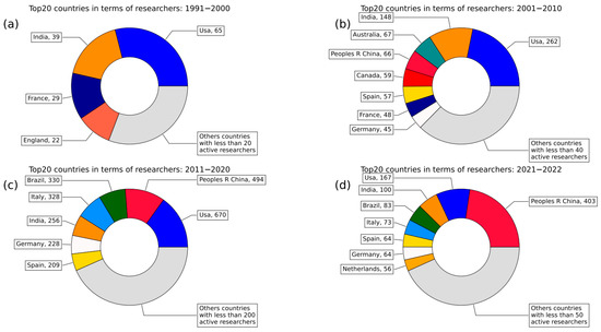 Top 20 countries in terms of researchers 1991–2000 (a), 2001–2010 (b), 2011–2020 (c), 2021–mid2022 (d).