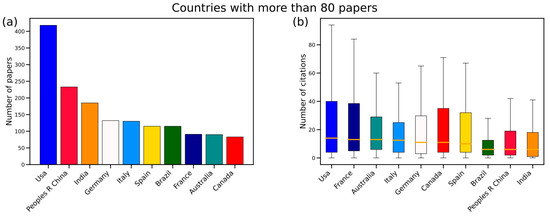 WoS dataset is quite limited. As such, to gain sufficient statistics, focus was placed on countries that released more than 80 papers in the entire time window (Figure 4a) and the distribution of the citations per paper was considered (Figure 4b).