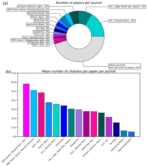 Among the journals that present the highest number of publications across the period under analysis (1977–mid2022), there are three that outperform all others in terms of published items (for journal abbreviation see Table S1). These are the International Journal of Remote Sensing (Int. J. Remote Sens. - Taylor & Francis), the International Journal of Applied Earth Observation and Geoinformation (Int. J. Appl. Earth Obs. Geoinf. - Elsevier) and Computers and Electronics in Agriculture (Comput. Electron. Agric. - Elsevier), with 307, 157 and 107 publications, respectively (Figure 6a). Taylor & Francis places only one journal in the top 10 while three other publishers feature more than one: Elsevier (3, those mentioned above and Geoderma), MDPI (2, Agronomy and Agriculture) and Springer (2, Precision Agriculture and Scientific Reports). This picture shows that there are long-established scientific publishers but also new players who are emerging in this sector, such as MDPI and PLOS.