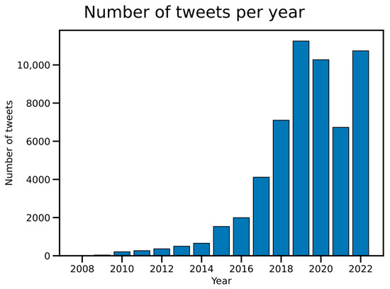 Messages published on Twitter focusing on the same topics were analysed. In particular, using the GET/2/tweets/search/all API [31] with Academic Access [32], authors accessed all messages containing the keywords used for retrieving the WoS dataset, from the very first message of Twitter in 2006 until 1 July 2022, mirroring the WoS query. More in detail, the query was “(agriculture OR agricultural OR agriculturalist OR agriculturalist OR agriculturalist OR agriculturalists OR agronomy OR agronomics OR agronomic OR agronomist OR agronomists) satellite”.