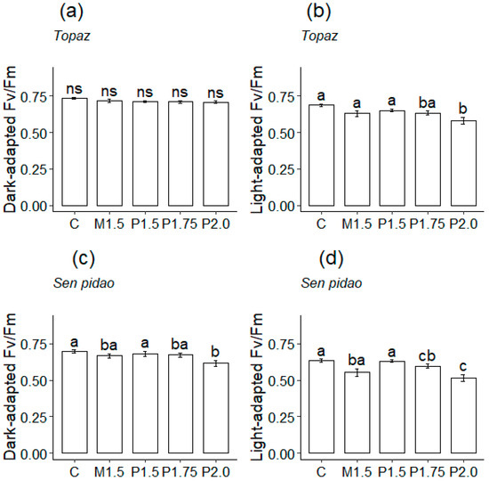 Dark-adapted (Fv/Fm) and light-adapted (F’v/F’m) of Topaz (a,b) and Sen pidao (c,d) varieties, respectively, under different herbicide treatments; P1.5, P1.75, P2.0 as pendimethalin rates at 1.5, 1.75, 2.0 kg a.i. ha−1, respectively, C represents the untreated control and M 1.5 is control 2 with 1.5 kg a.i. ha−1 S-metolachlor herbicide. ‘ns’ represents not significant, while means of the same letters are not significantly different at p < 0.05; error bars represent the standard error.