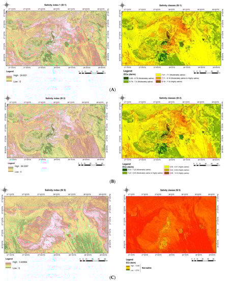 - Field electrical conductivity (ECe dS m−1) measurements were conducted in May–July 2021. The soil salinity maps were generated using ArcGIS 10.2.2 software [27].