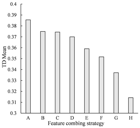 TD Mean values of the feature combing strategies. A: 5 bands+MI13; B: 5 bands + MI13 + NDI23 + DI23; C: 5 bands + MI13 + DI23; D: 5 bands+MI13+NDI23; E: 5 bands ++ NDI23; F: 5 bands + DI23; G: 5 bands + NDI23 + DI23; H: 5 bands.
