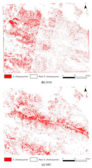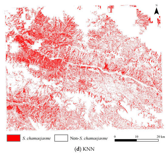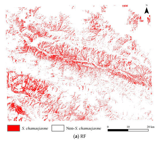 Based on the ASTER GDEM (https://earthdata.nasa.gov, accessed on 11 October 2021) and Vegetation map of the People’s Republic of China (1:1,000,000) [35], the snow/ice, bare land with the altitude above 4000 m, and mountain forest/shrub were hierarchically excluded from the image. Then, using the TWINSPAN-adjusted groups and 40 samples of residential area, farmland, road, and river chosen from the 166 non-S. chamaejasme sites, classification was performed based on the optimal feature combination, applying four machine learning algorithms. By grouping the resulted categories into the S. chamaejasme area and the non-S. chamaejasme area, the infestation of S. chamaejasme communities was identified.