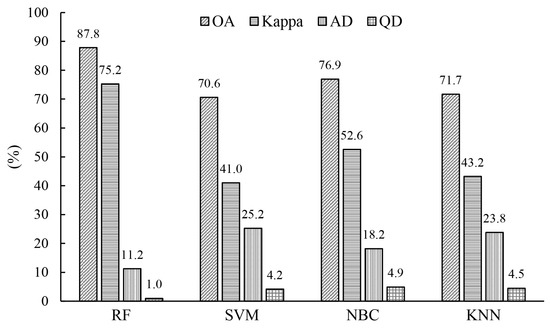 To accurately assess accuracy, the overall accuracy (OA), user’s accuracy (UA), producer’s accuracy (PA), and Kappa coefficient, in combination with Quantity disagreement (QD) and Allocation disagreement (AD), were adopted as assessment metrics. Quantity disagreement is defined as the amount of difference between reference map and predicted map, which is caused by the imperfect matching in the proportion of the classes. Allocation disagreement is defined as the amount of difference between reference map and predicted map, which is caused by the imperfect matching in the spatial allocation of the classes [36]. A lower value of quantity disagreement and allocation disagreement indicates good classification accuracy. The two metrics were calculated as follows: