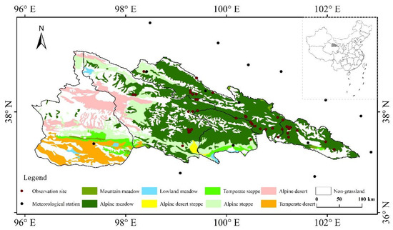 The study area (36.8926°–39.2110° N; 96.1380°–102.6405° E) is located in the National Park of Qilian Mountain, including Delingha City, Tianjun County, Qilian County, Gangcha County, and Menyuan County of Qinghai Province. Grassland is the most important land use type, accounting for 90% of the whole study area. The grassland types mainly include alpine meadow, mountain meadow, lowland meadow, temperate steppe, alpine steppe, alpine desert steppe, temperate desert, and alpine desert (Figure 1). The average annual precipitation is 232.4 mm, which has increased from northwest to southeast, and the higher precipitation was distributed in the central and eastern regions of the study area [23]. The mean annual temperature is 4 °C, and the spatial distribution form is relatively stable with little inter-annual variation. The temperature contour is consistent with the terrain profile [24]. The average elevation is 4000 m (Figure 1). It is an important ecological security barrier in western China, and it is also an important water source of the Yellow River and a priority area for biodiversity conservation.