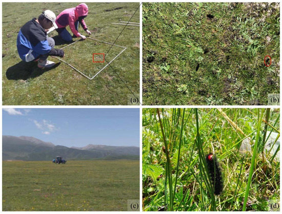 Field observation: (a) is field observation with 1 m × 1 m quadrat, (b) is the enlargement of a small part of the quadrat, (c) is the machine for spraying the chemical and biological insecticides, and (d) are the Gynaephora alpherakii feeding on grass.