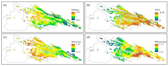 Spatial distribution of (a) digital elevation model (DEM); (b) average value of normalized difference vegetation index (NDVI) from 2000 to 2021; (c) average value of solar radiation (SRA) from 2000 to 2021; and (d) average value of precipitation (PRE) from 2000 to 2021.