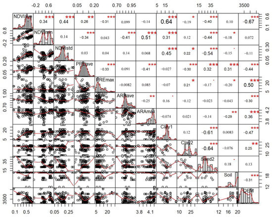 The correlation of Pearson coefficient among factors. NDVIave, NDVImin, NDVIstd, PREave, PREmax, SRAave, SRAmax, Clay 1, Clay 2, Sand 2, Soil, and DEM refer to average NDVI, minimum NDVI, standard deviation of NDVI, average precipitation, maximum precipitation, average solar radiation, maximum solar radiation, clay concentration of surface/bottom soil, sand concentration of bottom soil, soil type, and digital elevation mode, respectively. * denotes p < 0.05; ** denotes p < 0.01; *** denotes p < 0.001.