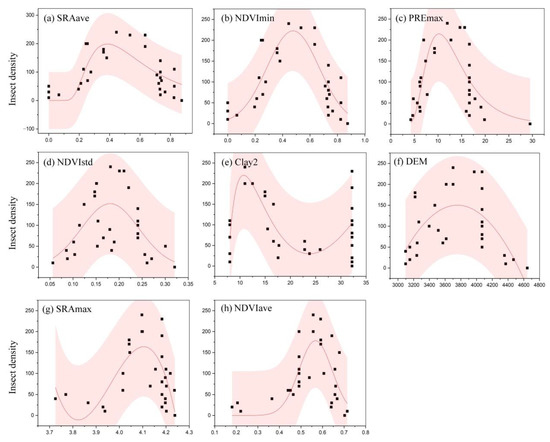 Relationship between environmental factors and Gynaephora alpheraki density: (a–h) refer to the average solar radiation (SRAave), minimum NDVI (NDVImin), maximum precipitation (PREmax), standard deviation of NDVI (NDVIstd), clay concentration of bottom soil (Clay 2), digital elevation model (DEM), maximum solar radiation (SRAmax), and average NDVI (NDVIave), respectively. The dash area presents a 95% confidence interval.