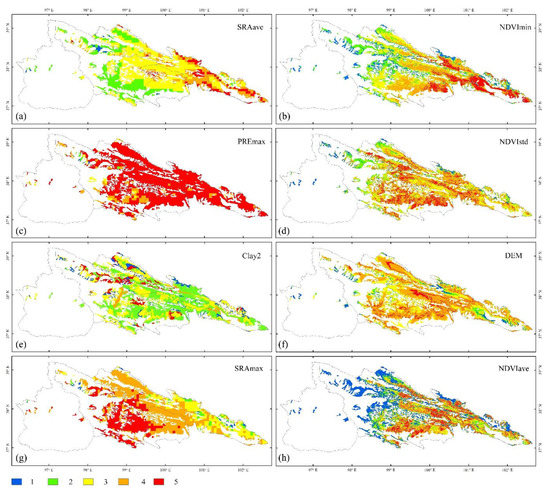 Spatial variation in the inhabitable index for different factors: 1–5 represent the inhabitable index; the degree of damage ranged from no damage to mild, moderate, severe, and serious, respectively. (a–h) refer to the average solar radiation (SRAave), minimum NDVI (NDVImin), maximum precipitation (PREmax), standard deviation of NDVI (NDVIstd), clay concentration of bottom soil (Clay 2), digital elevation model (DEM), maximum solar radiation (SRAmax), and average NDVI (NDVIave), respectively.