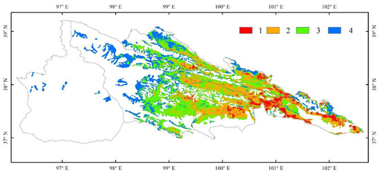 Spatial distribution of Gynaephora alpheraki inhabitable area; note: Inhabitable Areas 1–4 mean the inhabitability was very suitable, more suitable, suitable, and potentially suitable for the growth and development of pests, respectively.