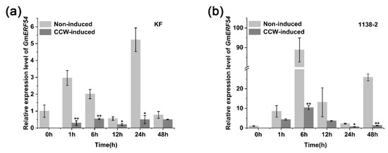 Further studies have shown that GmERF54 responds differently to CCW induction in insect-resistant cultivar and insect-susceptible cultivar (Figure 1). The expression of the GmERF54 gene decreased from 1 to 48 h after CCW induction in both the insect-resistant cultivar (KF) and insect-susceptible cultivar (1138-2), but the expression decreased to a significant level in KF 1 h after CCW induction (Figure 1). It was speculated that GmERF54 in KF may respond to CCW induction earlier or faster than that in 1138-2. Similarly, the Gbve1 gene in resistant cotton has a faster and stronger response to Verticillium dahliae inoculation than in Verticillium-susceptible upland cotton [79].