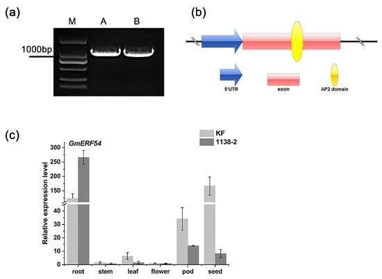 GmERF54 was cloned from QY leaf cDNA and DNA, respectively. The cDNA and DNA sequences of GmERF54 were the same by sequencing and gel electrophoresis (Figure 2a), indicating that the gene had no intron. The full-length coding sequence of GmERF54 is 1221 bp, and it encodes 406 amino acids. Its protein contains an AP2 conserved domain (Figure 2b). The homologous gene of GmERF54 in Arabidopsis is AtERF53 (At2g20880), and the similarity of their protein sequences is 37.41% (Figure S1). The overexpression of AtERF53 in Arabidopsis rglg1rglg2 double mutant enhanced the drought [61] and heat stress [62] tolerance of the mutant. Thus, GmERF54 may also be involved in the response to stress in plants. The qRT-PCR analysis showed that GmERF54 was expressed in all tissues of both KF and 1138-2, and the expression level of GmERF54 was different in insect-resistant and insect-susceptible soybean cultivars (Figure 2c).