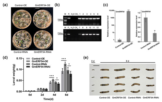 The hairy roots of soybean were used to conduct the forced feeding experiment of CCW using previously described methods [51,52]. Four-week-old fresh hairy roots containing GmERF54-OE, GmERF54-RNAi, Control-OE and Control-RNAi vectors were placed in plastic culture jars, respectively, and each culture jar had four third-instar larvae. Total weight of the four larvae was recorded before feeding, and 2, 4 and 6 days after feeding. The average larval weight was calculated. Samples in the plastic culture jar were replaced with fresh hairy roots at each weighing. No fewer than six replicates were set up in the experiment. Microsoft Excel 2021 was used for statistical analysis.