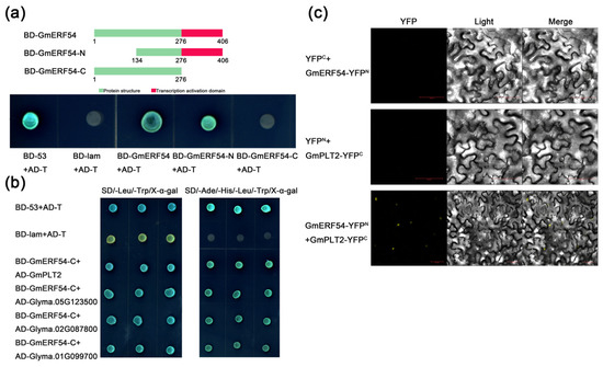 GmERF54 has transcriptional activation activity and interacts with GmPLT2. (a) Identification of GmERF54 transcription activation domain. BD-53 represents pGBKT7-53, BD-lam represents pGBKT7-lam, AD-T represents pGADT7-T, BD-GmERF54 represents pGBKT7-GmERF54, BD-GmERF54-C represents pGBKT7-GmERF54-C (C-terminal truncated 130 amino acid) and BD-GmERF54-N represents pGBKT7-GmERF54-N (N-terminal truncated 133 amino acid). (b) Yeast two-hybrid assay of the four proteins and GmERF54. The fact that yeast cells grew and turned blue on quadruple-dropout media (-Leu/-Trp/-His/-Ade/X-α-gal) is evidence of interaction. AD-GmPLT2 represents pGADT7-GmPLT2, AD-Glyma.05G123500 represents pGADT7-Glyma.05G123500, AD-Glyma.02G087800 represents pGADT7-Glyma.02G087800 and AD-Glyma.01G099700 represents pGADT7-Glyma.01G099700. SD/-Trp/-Leu/X-α-Gal represents double-dropout medium supplemented with X-α-Gal, and SD/-Trp/-Leu/-His/-Ade/X-α-Gal represents quadruple-dropout medium supplemented with X-α-Gal. (c) BiFC assay showed interaction between GmERF54 and GmPLT2 in tobacco cells. GmERF54 was fused with the N-terminal of YFP, and GmPLT2 was fused with the C-terminal of YFP. Scale bars: 50 μm.