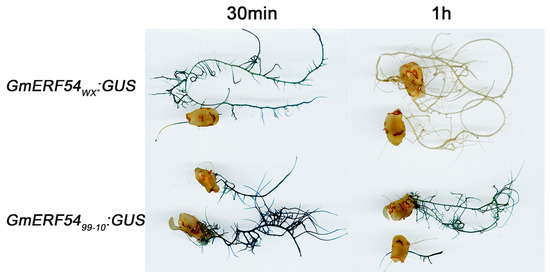 Soybean transgenic hairy roots of GmERF54WX:GUS and GmERF5499-10:GUS were used to access the activity of the GmERF54 promoter. As shown in Figure 6, both GmERF54 promoters from WX and 99-10 had activity and responded to CCW induction. Following 1 h of CCW treatment, the GmERF54 promoter activity decreased, compared with that after 30 min of CCW treatment. The activity of the GmERF54 promoter from 99-10 was higher than that from WX (Figure 6). These results indicate that the expression of GmERF54 appeared to be down-regulated in both the insect-resistant accession (WX) and insect-susceptible accession (99-10) after 1 h of CCW attack, compared with that after 30 min of CCW attack.