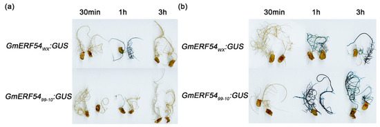 The GmERF54WX:GUS and GmERF5499-10:GUS recombinant vectors described above were transformed into soybean hairy roots and treated with exogenous MeJA (100 μM) and IAA (20 μM) solutions for 30 min, 1 h and 3 h, respectively. The activity of the GmERF54 promoters of both cultivars increased after 1 h of MeJA treatment and decreased after 3 h of MeJA treatment. Following treatment with MeJA for 1 h, the GmERF54 promoter activity of 99-10 was lower than that of WX (Figure 7a). Following 1 h of treatment with IAA solution, the GmERF54 promoter showed enhanced activity, which remained high after 3 h of treatment. In contrast to MeJA treatment, the GmERF54 promoter activity of 99-10 was higher than that of WX after 1 h treatment with IAA solution (Figure 7b). In conclusion, MeJA and IAA were involved in inducing the expression of GmERF54, but the GmERF54 promoters in WX and 99-10 showed different responses to exogenous MeJA and IAA.
