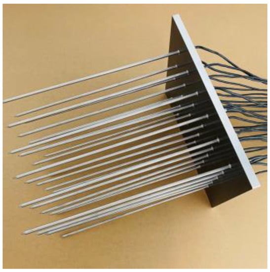 The test soil was collected from the greenhouse of the teaching and research base of Jilin Agricultural University (125°24′44.136″ N, 43°49′23.2104″ E, Changchun, Jilin Province, China), which was loamy clay with 34.76% clay grains, 26.44% chalk grains, 37.07% sand grains, and a 1313.9 kg/m3 density. The humus content of phaeozems in Northeast China tends to be higher than that in other types of soils []. After passing the soil samples through a 2-mm sieve, the wet basis moisture content of the collected soil was measured at 15.4% by the drying method, and the moisture content of the phaeozems was 10% when the optimum heat production conditions were obtained during microwave irradiation []. Thus, the soil moisture content was reduced by the natural air-drying method and the soil was loaded into clay pots (17 × 20 cm) for continuous microwave irradiation for 3, 6, 9, and 12 min. Microwave frequencies of 2.45 GHz and 915 MHz are generally suitable for industrial agriculture and households in China, and in terms of soil warming capacity, 2.45 GHz may be a more suitable choice if the soil is warmed to the same temperature []; for this reason, this study used microwave irradiation equipment with a microwave frequency of 2.45 GHz and a power of 2 kW; the main materials are shown in Table 1. The internal temperature of the soil after microwave treatment was measured by a PT100 sensor (Figure 1), which was inserted vertically into the soil to measure each centimeter of soil temperature in turn. The pots were numbered MW3, MW6, MW9, and MW12 for the time periods 3, 6, 9, and 12 min, respectively, and the illuminated group without microwave treatment was labelled as CK. Each microwave time period and the control group had four replicate treatments. The soil area temperature after microwave irradiation for different time periods is shown in Table 2 [], and the treated soil was placed in the National Experimentation for Precision Agriculture Research Demonstration Base No. 1 greenhouse (National Experimentation for Precision Agriculture, 40°10′31″ N, 116°26′10″E, Beijing, China) for 30 days of soil static management. The average temperature in the greenhouse during the 30 days was 27 °C and the humidity was 87.7%.