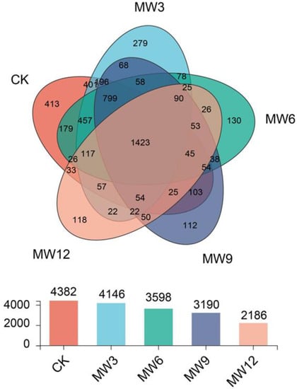 OTU is a uniform marker artificially assigned to a taxonomic unit (strain, genus, species, group, etc.) in population genetics studies. To determine the number of overlapping OTUs and specific OTUs of soil bacteria under microwave treatments at different time periods, community analysis was performed using Veen plots (Figure 3); 1423 overlapping OTUs were present in the five treatments, accounting for 25.6% of the total number of OTUs. Among them, 4382 bacterial OTUs were unique to CK, 4146 were unique to MW3, 3598 were unique to MW6, 3190 were unique to MW9, and 2186 were unique to MW12.