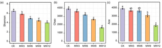 Effect of different microwave treatments on bacterial diversity shown via the (a) Shannon, (b) Chao, and (c) Ace indices. (mean ± SE, n = 4). Different lower-case letters indicate the significant differences of variable means among the different microwave time periods. CK: control; MW3: microwave irradiation of the soil for 3 min; MW6: microwave irradiation of the soil for 6 min; MW9: microwave irradiation of the soil for 9 min; MW12: microwave irradiation of the soil for 12 min.